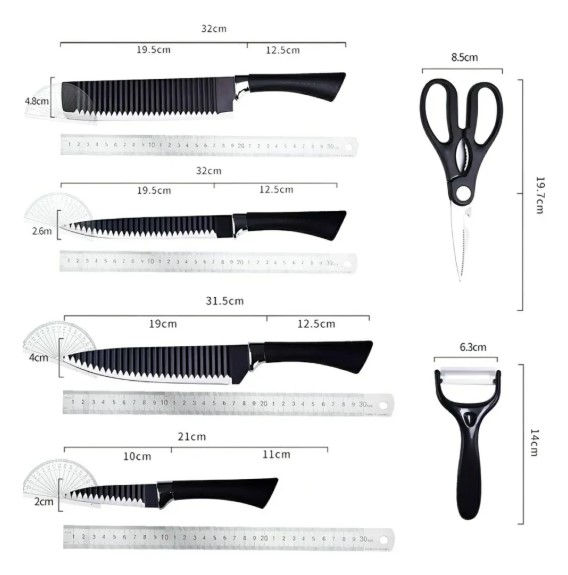 Este Kit de facas de corte conta com seis peças em revestimento antiaderente, lâminas super afiadas e lindo design, na cor preta O cabo ergonômico garante maior segurança no manuseio São peças de aço inox com grande durabilidade e alta qualidade, garantindo um corte perfeito e equilibrado das carnes.